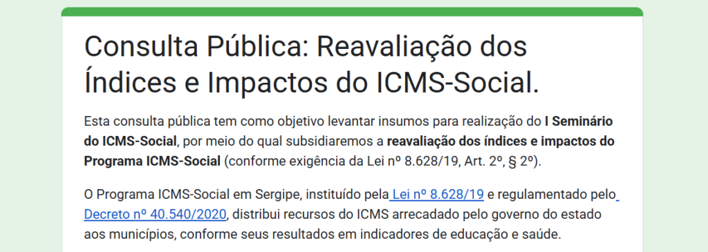 Por meio da consulta e do seminário, a Comissão Especial do ICMS-Social submete à apreciação pública os principais pontos do programa, atentando à exigência de reavaliação de seus índices e impactos (conforme Lei nº 8.628/19, Art. 2º, § 2º).